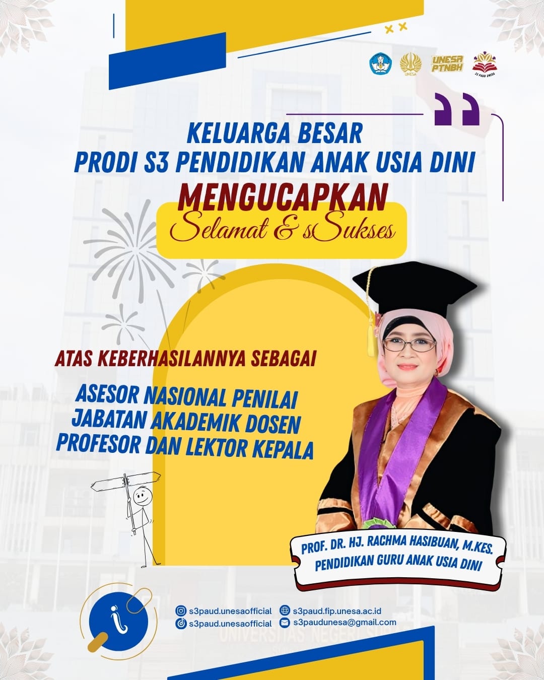 Program Studi S3 Pendidikan Anak Usia Dini, Fakultas Ilmu Pendidikan, Universitas Negeri Surabaya (UNESA), menyampaikan apresiasi atas capaian Pro