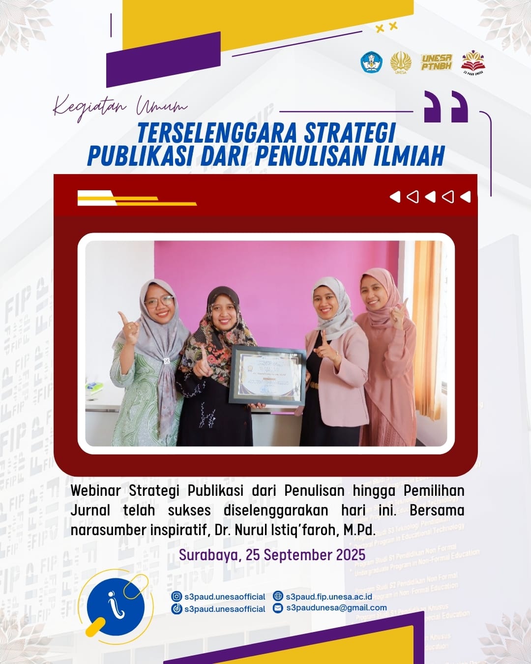 Program Studi S3 Pendidikan Anak Usia Dini (PAUD), Fakultas Ilmu Pendidikan, Universitas Negeri Surabaya (UNESA) sukses menyelenggarakan Webinar Stra